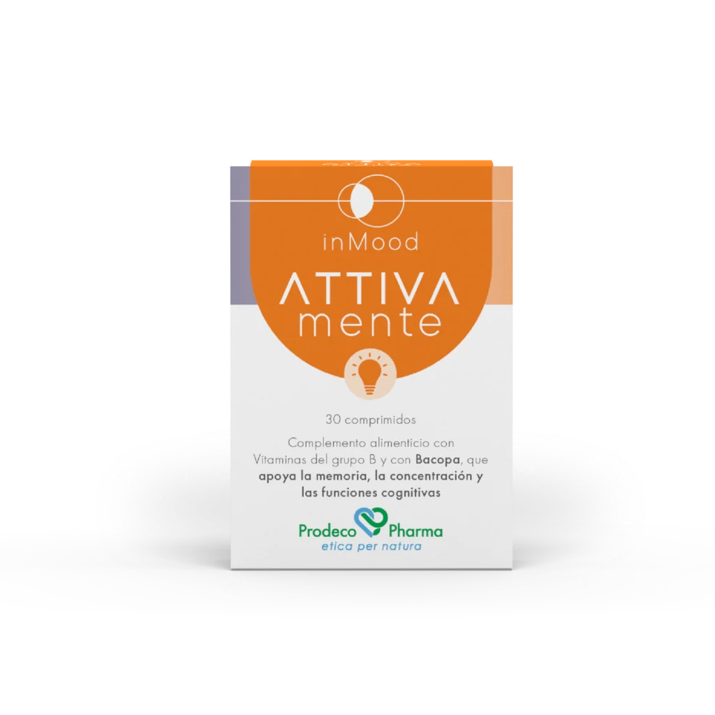 Complemento alimenticio en comprimidos bicapa a base de Bacopa, Aronia, Mango, Vitaminas del grupo B del Trigo sarraceno y Colina, con un innovador sistema de liberación controlada para favorecer la memoria y la concentración precisamente cuando se necesita.